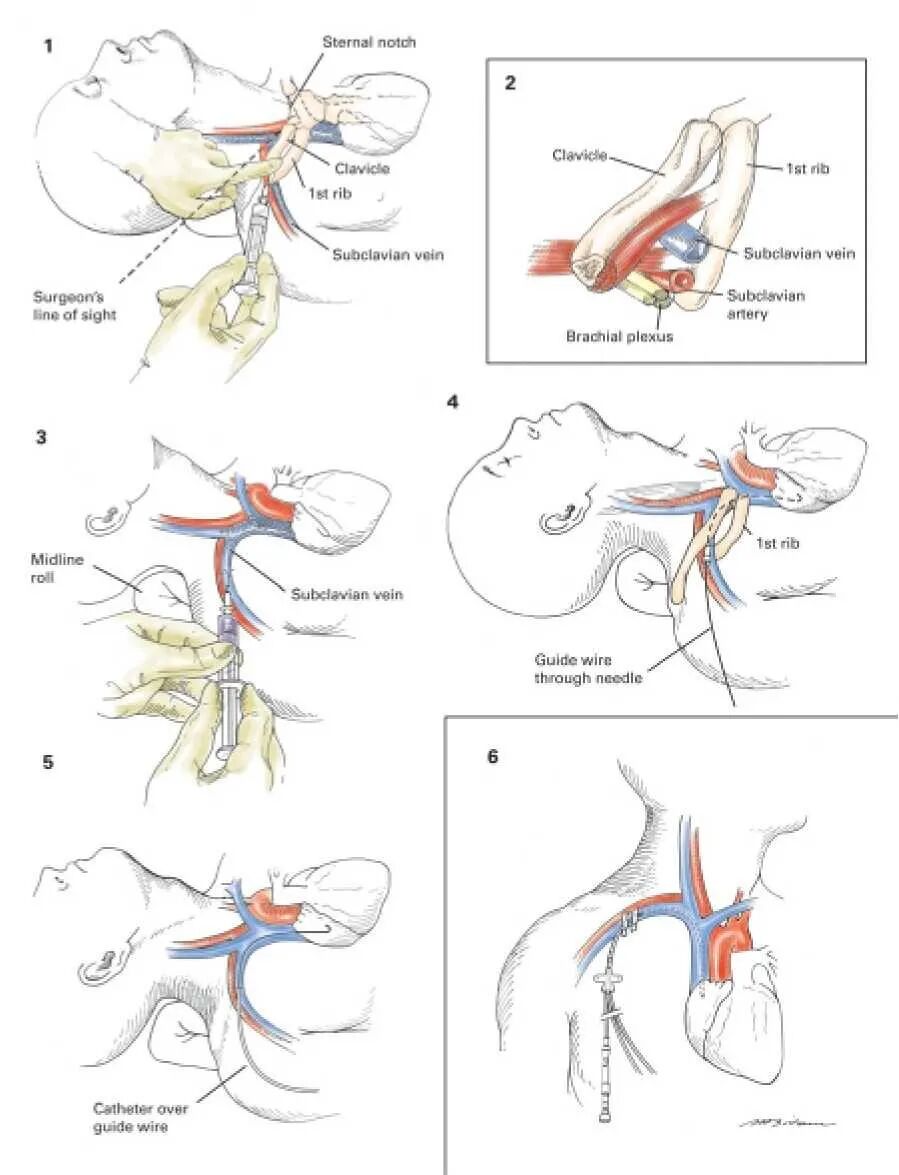 在选择静脉穿刺点的时候,也需要考虑多项因素。锁骨下静脉入路的机械并发症比颈内静脉入路更多见,而股静脉入路的并发症最少。但锁骨下静脉入路的血流感染和症状性血栓形成更少见,而且由于方便护理,锁骨下静脉入路(下图)常被选择。