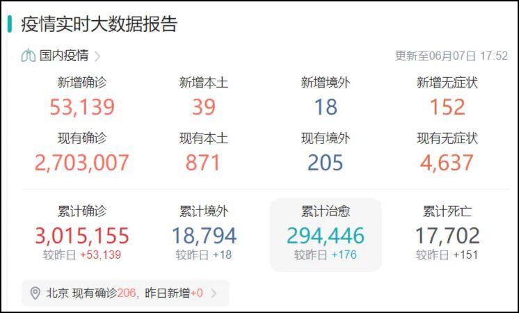 截至6月6日24时,据31个省(自治区、直辖市)和新疆生产建设兵团报告,现有确诊病例1076例(其中重症病例50例),累计治愈出院病例218096例,累计死亡病例5226例,累计报告确诊病例224398例,无现有疑似病例。累计追踪到密切接触者4130371人,尚在医学观察的密切接触者117819人。