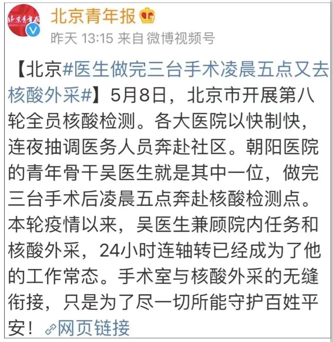 上个月8号,北京市第八轮全员核酸,各大医院连夜抽调医务人员参加检测。其中朝阳医院的吴医生也是其中一位,他连夜做完三台手术后已是凌晨五点,来不及休息又急匆匆奔赴核酸检测点。