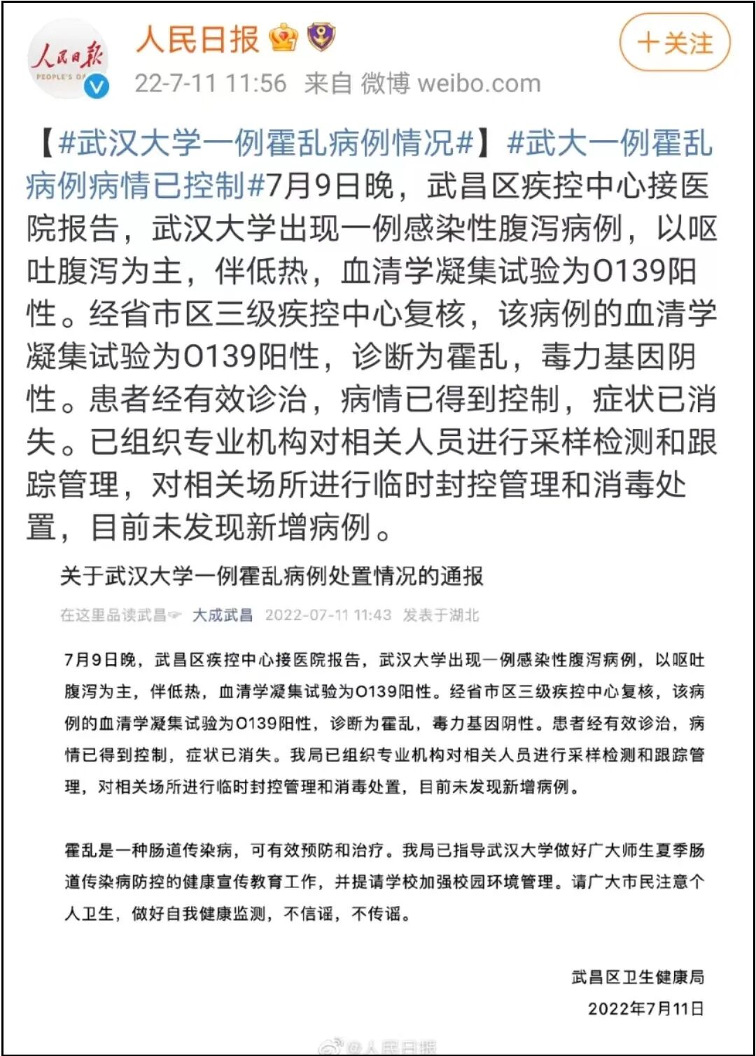 昨日,有网友报料称,武汉大学工学部宿舍疑似发现一例霍乱,校方发布了《关于加强夏季肠道传染病预防的温馨提示》,并且对全栋学生都进行了统一肛拭子检测。