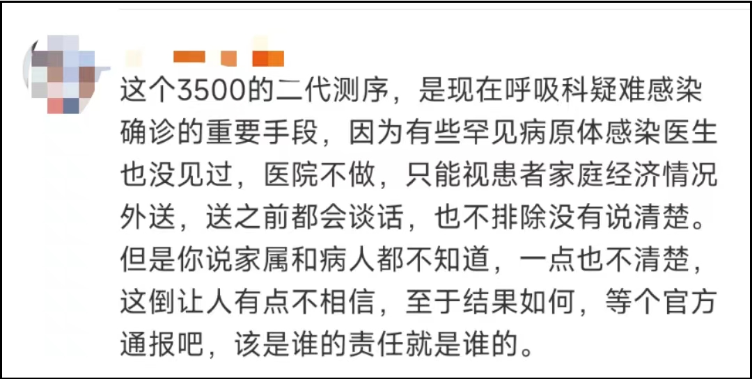 2.对于个人收款3500元的问题。通过家属微博下面网友的回复,能清楚地了解这笔钱并非医生收取,而是外送检查的费用。