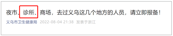 这家诊所,正是上述义乌卫健局排查通告中的诊所。要求8月1日15时至20时期间到过西谷村益家诊所的人员,立即主动向所在社区报备,在家等候,请勿外出。
