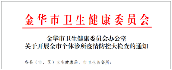 8月4日10点左右,金华卫监公众号发布消息,就浙江省金华市卫健委下发的红头文件,在全市范围开展个体诊所疫情防控大检查。