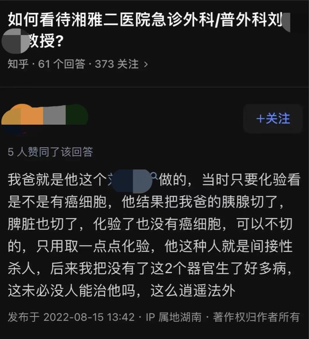 近期,网络上出现反映我院刘某某相关问题的信息。医院对此高度重视,迅速成立调查组,并于8月16日停止刘某某工作以配合调查。初步调查发现,刘某某在医疗过程中存在不规范行为。经医院研究,决定免去刘某某湖南省创伤急救中心副主任职务,停止其处方权及手术权限。医院将对刘某某有关问题线索展开进一步调查,根据调查结果做出相应处理,并及时向社会公布。