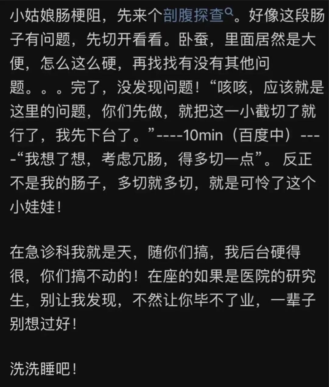 1.手术找不到肠梗阻,把正常肠管切下来给家属看:为了让家属用止血药把产科剖腹产的血袋子擦身上。