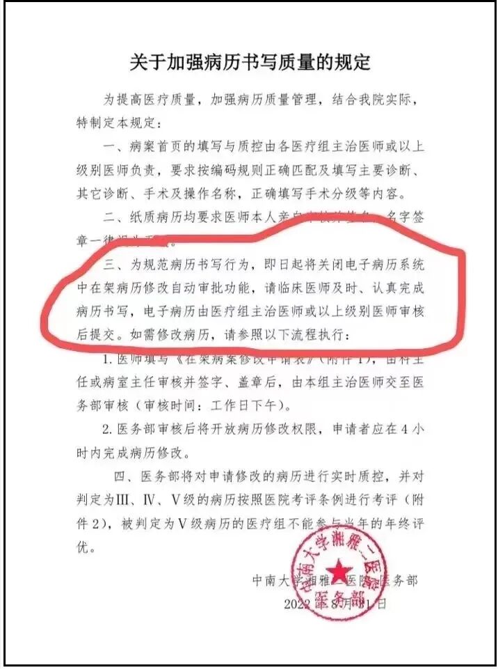 根据院内下发规定,我们可以看到其中明确写着“为规范病历书写行为,即日起将关闭电子病历系统中在架病历修改自动审批功能,请临床医师及时、认真完成病历书写,电子病历由医疗组主治医师或以上级别医师审核后提交。”