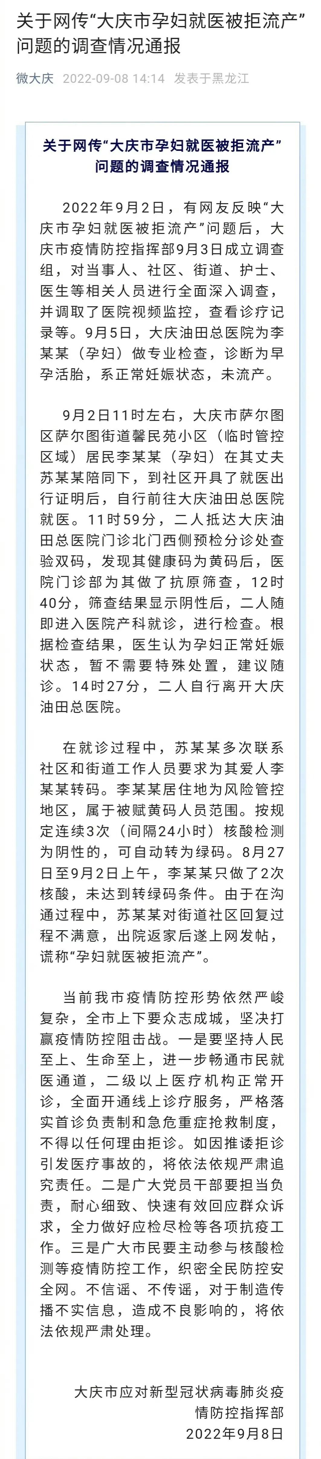 大庆市疫情防控指挥部9月3日发布通报“针对近日网民反应的大庆孕妇就医流产问题,大庆市成立调查组进行全面调查”,并迅速对当事人、社区、街道、护士、医生等相关人员进行了全面的调查。