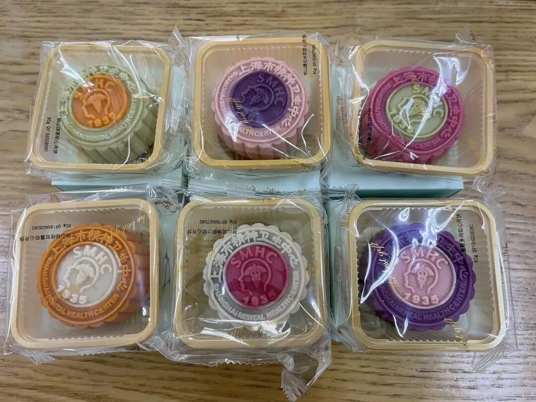 今年的“精神饼”包装采用了素雅的淡绿色为主色调,中间印有医院的院徽和一个宛平南路600号门牌号,打开包装,里面有6个色彩各异的拼色月饼。除了外观,今年月饼的口味也全部更新,分别有葡萄多肉、杨枝甘露、抹茶、提拉米苏、蔓越莓和斑斓椰汁6种口味。