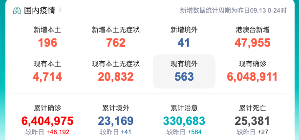 @国家卫健委 9月13日0—24时,31个省(自治区、直辖市)和新疆生产建设兵团报告新增确诊病例237例。其中境外输入病例41例(福建11例,广东11例,上海8例,云南5例,北京2例,四川2例,天津1例,重庆1例),含5例由无症状感染者转为确诊病例(广东4例,四川1例);本土病例196例(四川127例,北京18例,山东10例,西藏8例,内蒙古7例,广西7例,广东6例,湖南4例,贵州3例,江西2例,黑龙江1例,上海1例,重庆1例,新疆1例),含58例由无症状感染者转为确诊病例(四川54例,北京1例,重庆1例,贵州1例,新疆1例)。无新增死亡病例。无新增疑似病例。