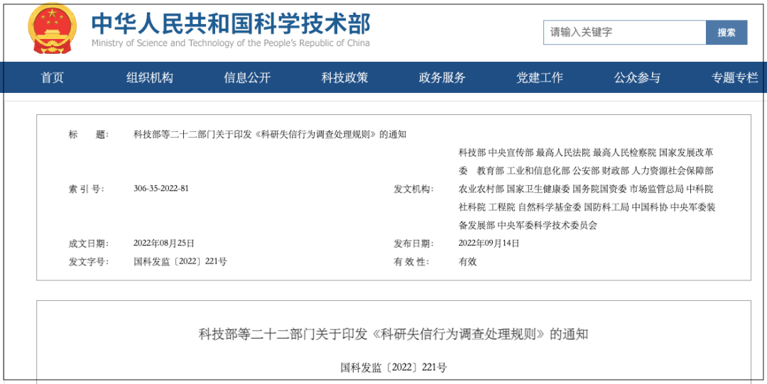 9月14日,科技部、中央宣传部等二十二部门印发《科研失信行为调查处理规则》(以下简称《规则》),进一步规范了调查程序,统一了处理尺度。