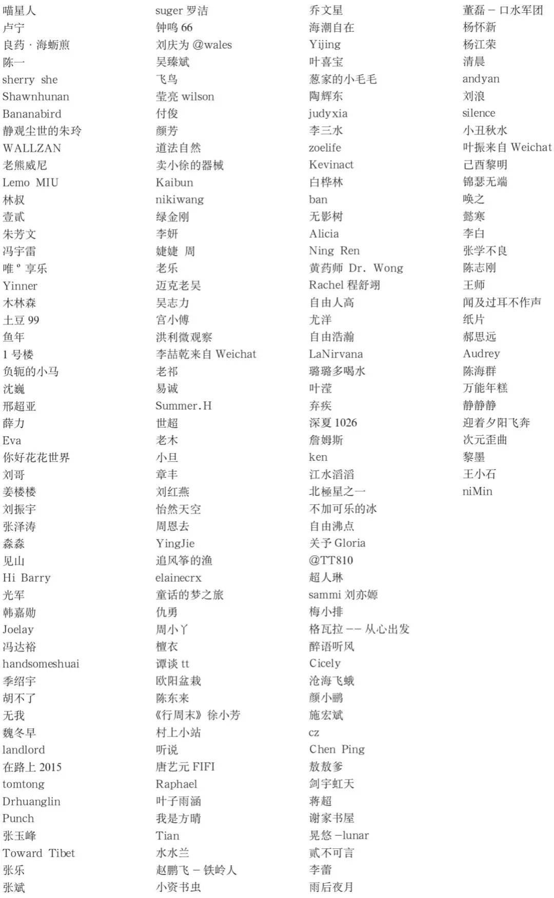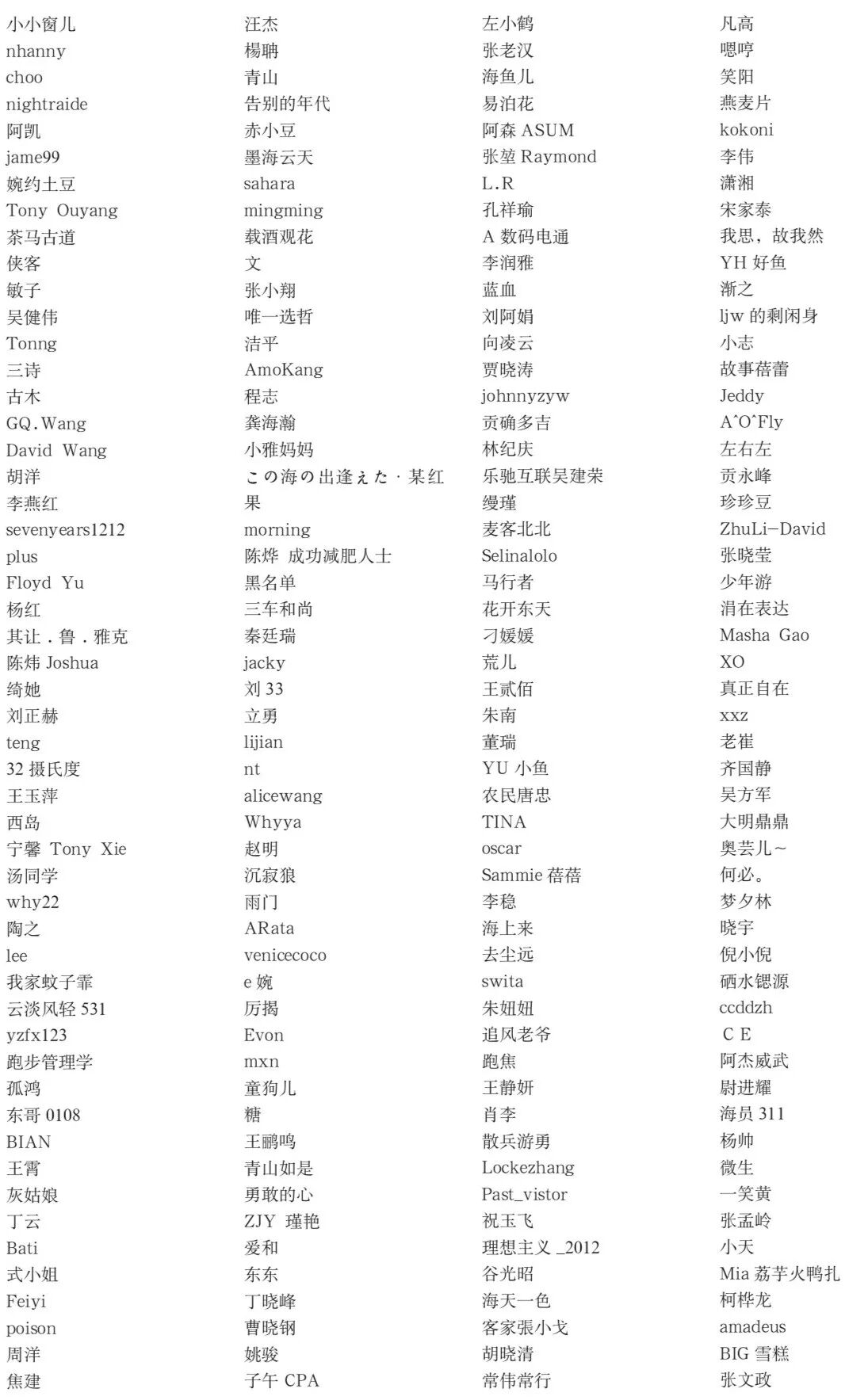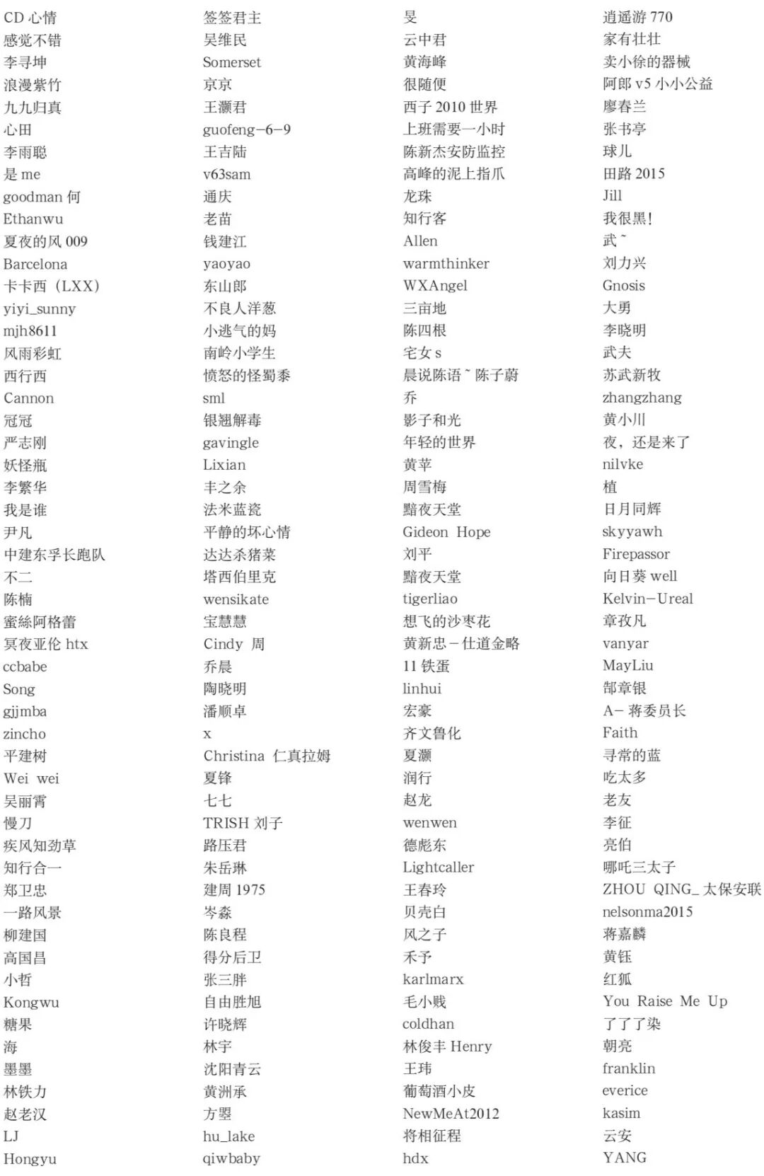 2015年,通过“开始众筹”平台,我们为三部曲发起众筹,社会反响热情之高令人深受感动。以下诸君通过众筹,参与了本书的出版,共同为之贡献了力量,诸位与我们的共同前行,是比出版更令人鼓舞的事情。在此我们衷心表示感谢,并对图书因故延迟表示诚挚的歉意。