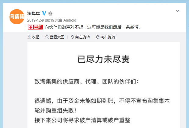 拖欠账款超过19亿元,失联130天,让几万人睡不好觉,这个人最近终于现身,引来骂声一片。他就是近3年来,跑得最猛,却败得最快、最惨,曾经被认为有潜力成为第二个拼多多的淘集集的创始人兼CEO,张正平。淘集集于2018年8月上线,号称缔造了一个创业公司的“速度神话”:成立两周就取得200万元销售额,短短四个月,月活用户规模就突破一千万,半年时间用户总量超过1亿。要知道,拼多多用户量突破1亿用了近1年的时间。然而,仅仅过了不到一年半的时间,淘集集就在2019年12月9日正式宣告破产,张正平也从此失联。失联之后的首次露面,是在朋友圈里晒吃饭喝酒的照片,依旧潇洒滋润,但一句“TJJ的事情过去了”,彻底激怒了很多人,波澜再起。就像张正平朋友圈截图中那条留言所说,“我们那么多员工工资呢?你取(去)了苏宁,难道就不考虑我们这些淘集集的员工了?你对我们一点亏钱(欠)都没?”随之而来是网络上对张正平的谴责与声讨,他被称为“彻头彻尾的loser,无担当”。其实移动互联网创业大潮之下,创业失败的例子比比皆是,但闹成这样的,似乎不多。张正平是产品经理出身,写过代码,做过策划,在一家电商代运营平台就职的经历让他正式成为了一个电商人,创立淘集集前也曾在一家电商平台担任过CEO。他曾在一次专访中说,自己是一个追求完美的人,写代码也好,做策划也好,不能有瑕疵,希望自己做出来的东西,无论是对自己、对对公司还是对用户,都一定要有一个完美展现。他可以用比别人短很多的时间把工作做完,但他愿意花更多的时间去一遍遍完善。他还说,一般去产品推介会的时候没人能说得过他,不是因为嗓门大,而是因为他已经把所有问题都考虑到了,面对所有人的问题,他都可以给出一个合理的解释或者反驳。至于对淘集集问题的处理,现在看来,似乎他也早有对策。淘集集当年一上线,就快速成为焦点,被称为以拼多多为代表的下沉市场新贵,甚至可以视作整个电商行业的一匹黑马。下沉市场,流量洼地,红利,风口,把这些词拼凑到一起,淘集集的一夜窜火似乎合情合理。根据公开资料显示,淘集集上线两月,便完成了4500万美元的A轮融资,据称投后估值达到2.42亿美元。烯牛数据显示,其A轮投资方包含老虎基金、DTSGlobal、险峰旗云三家机构。然而在2019年10月,似乎一夜之间,淘集集就站在了崩溃边缘。因为资金链断裂,淘集集严重拖欠货款,供应商组团上门,催要欠款,甚至有被欠款的商家爬上了楼顶,欲以死相逼。其实淘集集拖欠款项从2019年8月就已经开始,当时有被拖欠货款的商家爆料,称在8月时,淘集集就已经发出公告,驳回所有7月10日之后的商家提现申请。而矛盾激化的原因,就在于此公告发布前的提现申请一直到10月份也没有被通过,这才有了商家集体上门催款的一幕幕。当时,张正平以公司CEO的身份出面,发布了致歉信。他坦白资金链已经断掉,无能力支付货款。他也向媒体坦言,拖欠供应商货款接近9亿,加上各种其他账款,总额16亿元左右。但实际上,据腾讯《深网》所掌握的消息,淘集集欠债总计超过19亿元,债权人超过3万。张正平拿出了两套解决解决方案:一种是债务重组,淘集集商家先拿回一部分货款,剩下的还要等淘集集有能力之后偿还;第二种,是债转股,即淘集集先支付一定的货款,剩下的部分债务折换成商家持有淘集集的股权,由张正平代持。而不管怎样,货款能否全部结清,都要看淘集集是否能够找到新的投资,能否有机构愿意接盘,以及重组成功之后,估值能否达到其约定的15亿美金和20亿美金甚至上市。这些,对于当时急于拿回货款的商家而言,其实无异于画饼充饥。不过,还是有不少商家签了协议,这其中必然是存在一定的信任。催款危机就这样被张正平化解了。此后一段时间,淘集集似乎稳定了一些,双十一表现很不错,并没有太受重组的影响。先是货款提现再次延迟,公司的支付宝账户被冻结,员工工资无法发放,新投资人迟迟不走款。12月3日还发公告称淘集集已经与国内大型集团顺利签署股权投资协议,12月9日张正平就发出公告宣布破产,并自此失联。淘集集虽然破产,但欠下的债谁来还?被坑惨的商家该怎样挽回损失?这些问题,张正平本人也给不了答案。从资金链断裂,到挪用供应商货款,不难看出,淘集集对于外部资金的依赖过于严重,本身并没有造血能力,又或者说,淘集集的根本意图在于快速复制拼多多的路径,因为拼多多已经把市场教育好了,淘集集只要在玩法上下点功夫,即便不能成为第二个拼多多,也未必不能成功。但导致淘集集一夜崩溃的最大祸根,也正是其成为黑马的野蛮增长套路。淘集集的套路与拼多多有很大的相似度,和拼多多一样的ABB命名法,同样的下沉市场拼购,就连玩法上也在“贴身肉搏”、“疯狂补贴”、“一元拼团 ”、“ 限时秒杀 ”、“ 十元五件 ”、“亏本上新”、“砍价免费拿”……为了和拼多多的“拼得多,省得多”形成区隔,淘集集的口号是“买得多,赚得多”。这又是一个套路,现金补贴+分销返利。用低价吸引并促成第一次交易,用现金补贴促成下一次的消费,分销返利则是一面促进裂变拉新,一面促进老用户留存,并驱动老用户的活跃度。其实这样的套路并不新鲜,核心目的还是为了拉新与促活,但确实让淘集集在短时间内积累了庞大的用户量。只不过,淘集集确实错过了最佳的社交电商红利期和微信的裂变带