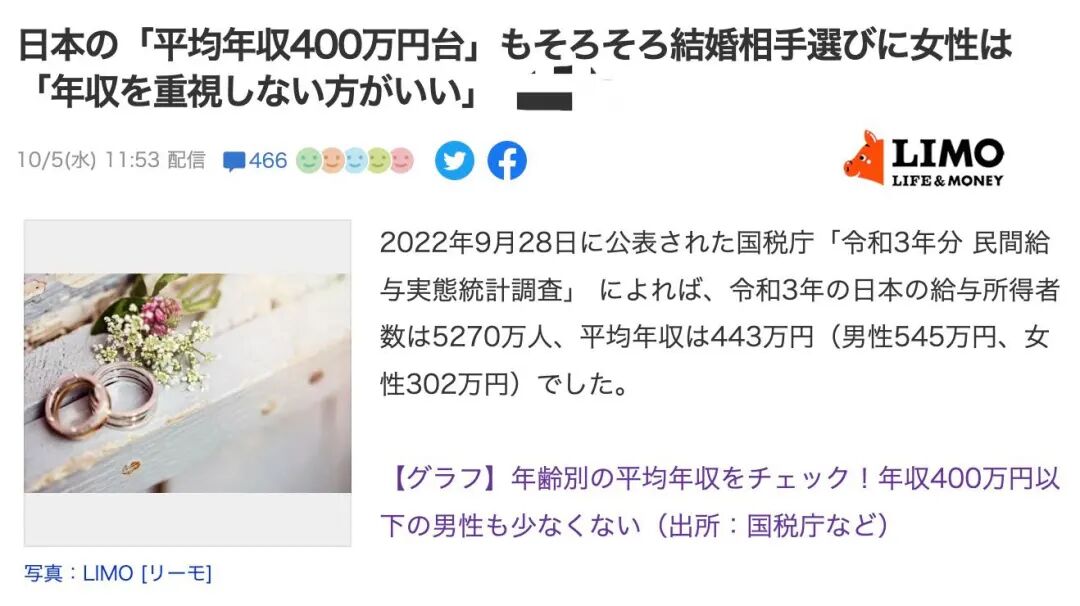 然而,时代在不断变化,今天,四分之三的日本女性都有工作。根据厚生劳动省的“2021年生活条件基本调查”,从职场女性细分来看,约30%女性为正社员,近40%女性为兼职员工。在价值观瞬息万变的当今社会,日本媒体开始推崇或许是时候不要太看重结婚对象的年收入这种观点。