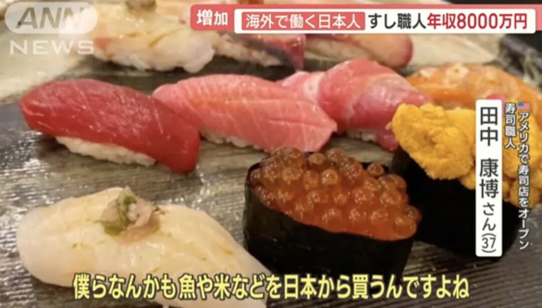 根据日本新闻报道,随着日元的贬值,想到国外找工作的日本人激增。在一些国家,日本料理广受欢迎,厨师工资是日本本土三倍,所以很多寿司师傅前往海外发展。在美国,甚至有的寿司师傅年薪高达8000万日元(400万人民币)。