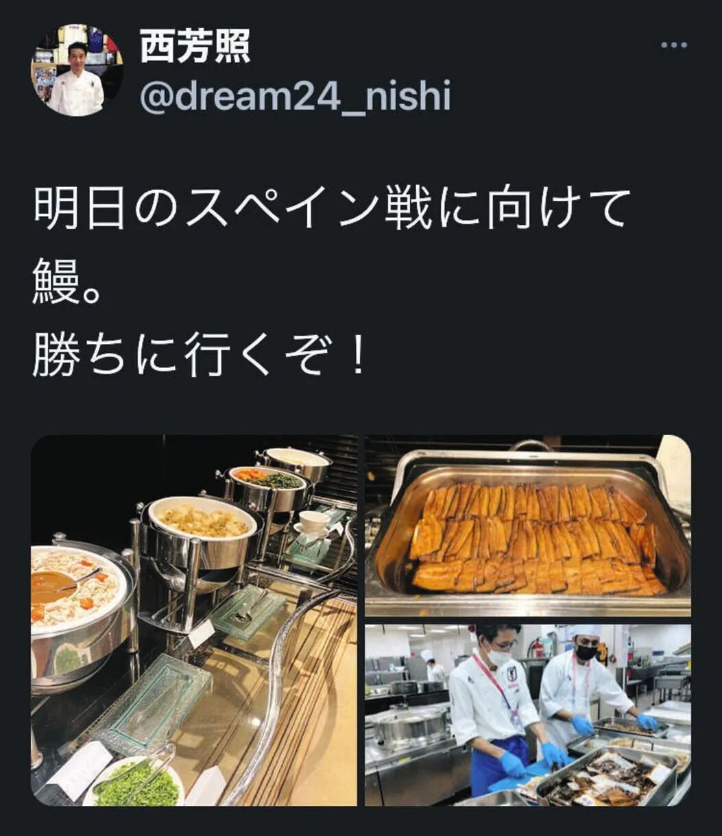 在12月1日凌晨,主厨西芳照更新推特:“为了明天的西班牙之战。为大家准备了鳗鱼。我们要赢啊!”配上烤鳗鱼的照片。大概,鳗鱼是国足的吉祥物,会带来好运!评论下方,日本国足队员纷纷点赞。