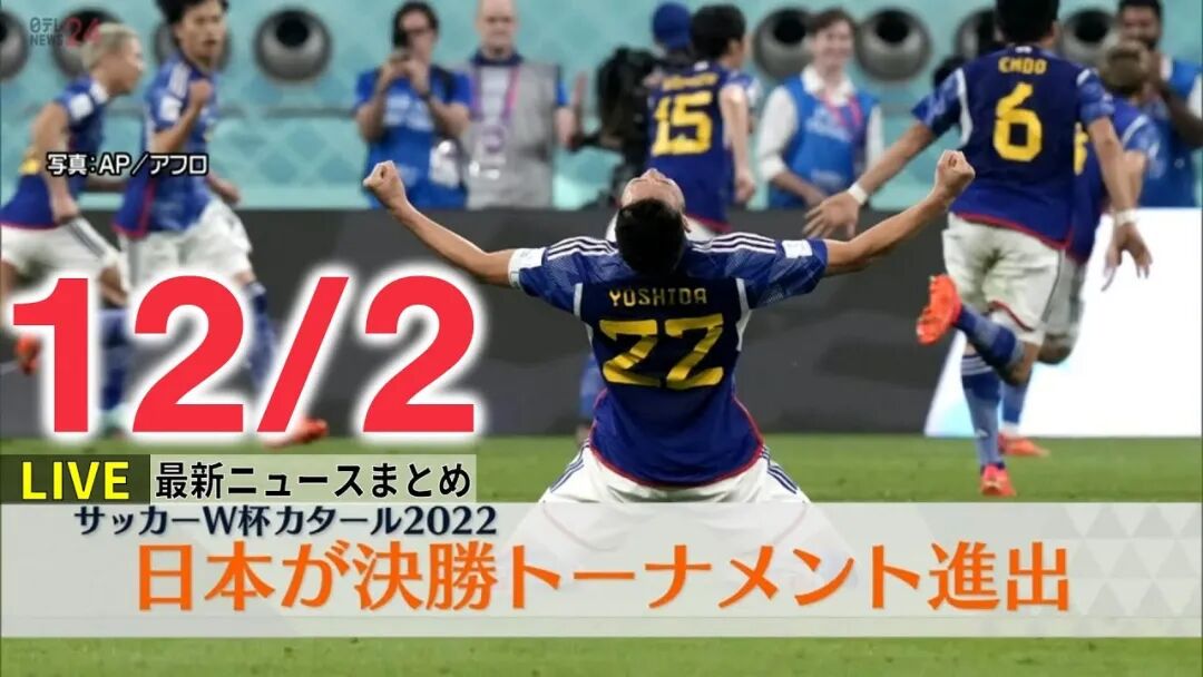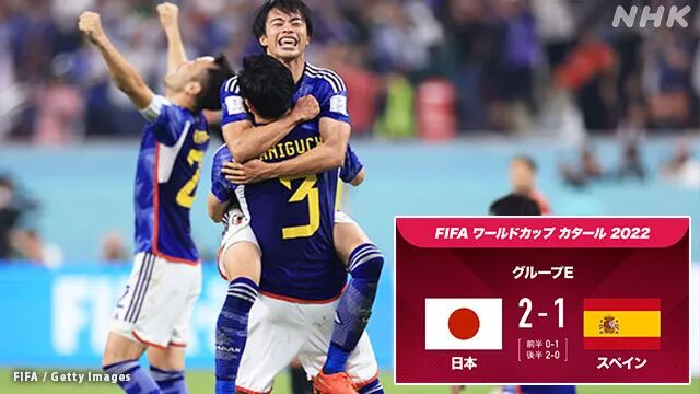 12月1日,卡塔尔世界杯小组赛E组,日本队在3分钟内取得两粒进球,2:1逆转战胜西班牙队,两队携手晋级16强。