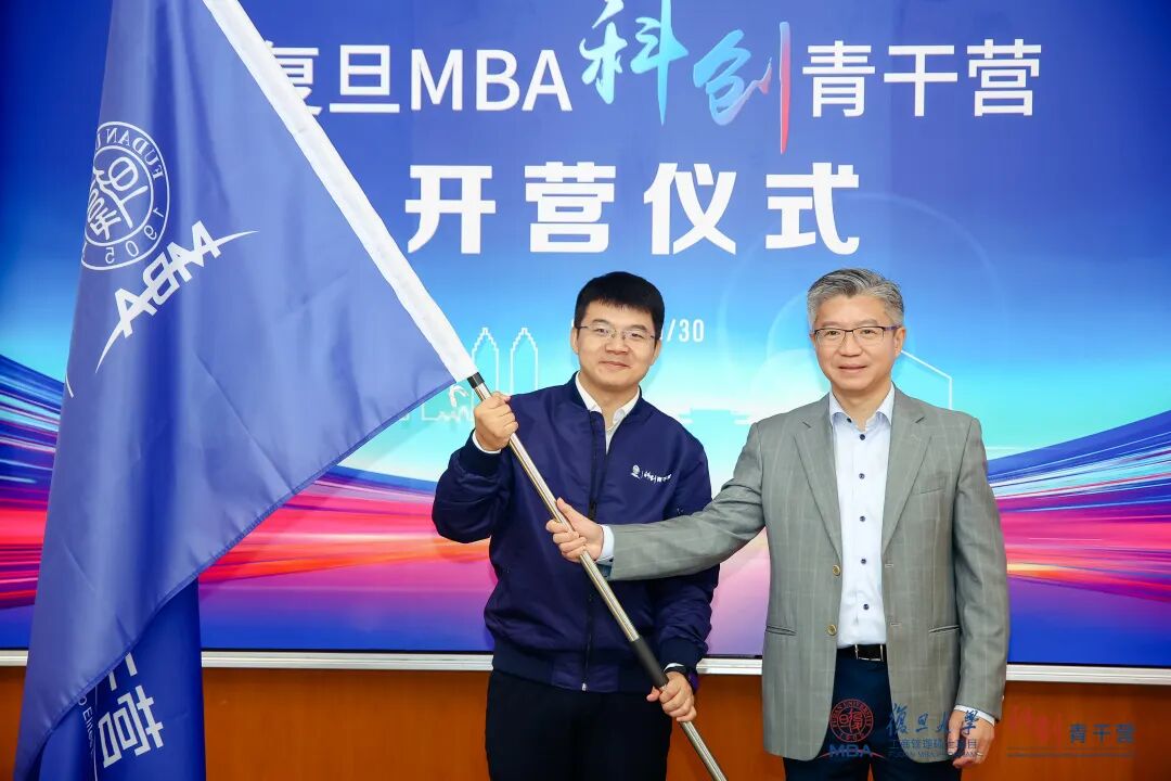 陆雄文院长向学生代表朱怡君授予科创青干营营旗,64位怀揣科创梦想的复旦MBA学生将开启科创学习的征程。