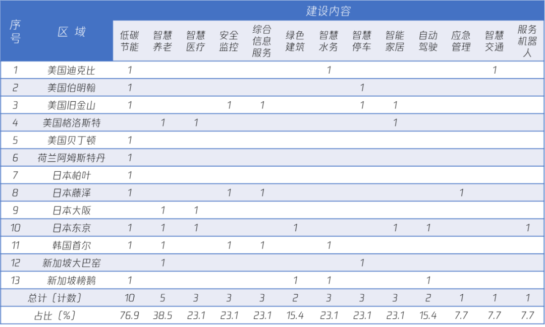 从建设重点看,注重小而美的场景应用、注重基于投入产出的市场化模式探索。一是更加关注清洁环境和可持续发展,从服务和满足家庭、社区需求出发,通过使用各种现代技术减少家庭、社会的能源消费开支,提高能源资源的利用效率,在统计的13个典型案例中建设低碳环保和分布式能源系统的占到总数的76.9%;二是面向老龄化社会和银发服务,大力推广智慧养老(38.5%)和智慧医疗(23.1%)应用,构建区域医疗养护网络;三是应对劳动力资源不足积极推动新型自动化科技的社区应用,包括自动驾驶、服务机器人、气动垃圾收集系统等;四是关注市场化推广,紧密围绕家庭和人的需求,综合考虑降低成本、实现多样性选择等,适度考虑引入先进的理念和技术。可持续发展方面,IBM迪比克市智慧城市项目以永续发展为核心目标,重点对能源、水务以及交通三大系统进行升级重建。日本三井柏叶智慧城市通过建设统一的智能数据收集中心,实现家庭和社区能源的自我管理。松下藤泽智慧城市围绕环保、能源、安全三大方向提出战略目标,建设了分布式能源网络、HEMS能源管理系统、虚拟电子围栏、灯光跟随等数字应用。新加坡榜鹅数码城市也集中建设家庭能源管理系统、太阳能集中供冷系统、气动垃圾收集系统、无人驾驶巴士等绿色项目。适老服务方面,英国格洛斯特智能屋试点使用红外线和感应式坐垫自动监测老年人在屋内的走动,屋中还配有医疗设备,可以为老年人测心率和血压等,并将测量结果自动传输给相关医生。新加坡的远程视讯医疗系统,可以通过手机和电脑端App实现远程医疗咨询。本地化部署的智能医疗康复中心,病人通过可穿戴式设备在康复师的视频指导下,远程进行医疗康复。韩国首尔恩平智慧城市为老年人和残疾人配备了定位装置,一旦老年人和残疾人离开了恩平或触碰了报警铃,其位置信息将会通过短消息发送给监护人。先进技术应用方面,UPS Flight Forward使用无人机将佛罗里达州CVS药房的处方药交付给美国最大的退休社区,该社区有135000多名居民。丰田东京智慧小镇则引入了服务机器人来执行现场医疗看护任务。IDC数据显示,中国城市数字化转型建设领域亦十分广泛。主要包括基础设施、政务服务、城市治理、民生服务、产业发展、能源环境等方面。![]()