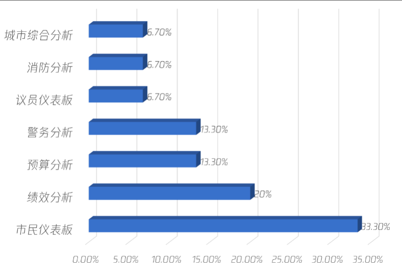 进一步分析显示,在线政务服务方面,接近2成的项目(18%)引入了AI、区块链等新兴技术,例如使用NLP技术响应市民需求、工单自动集成、区块链投票等。城市仪表板/数据分析方面,市民仪表板最多(33.3%),其次为绩效分析(20.0%),再次为预算分析和警务分析(13.3%)。![]()