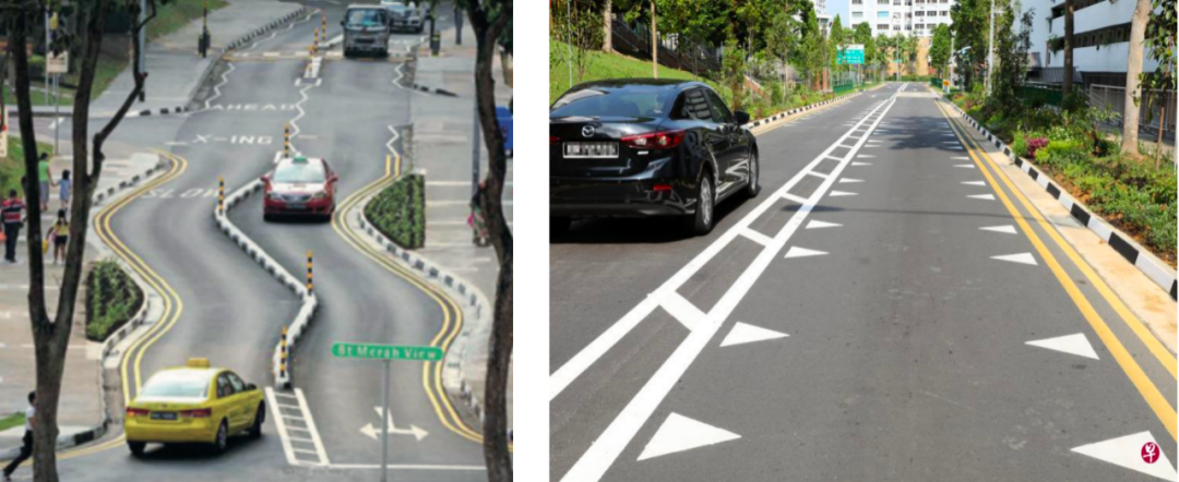 右图:三角标记令车道看似更狭窄,借此鼓励驾车者减速 (图片来自联合早报)