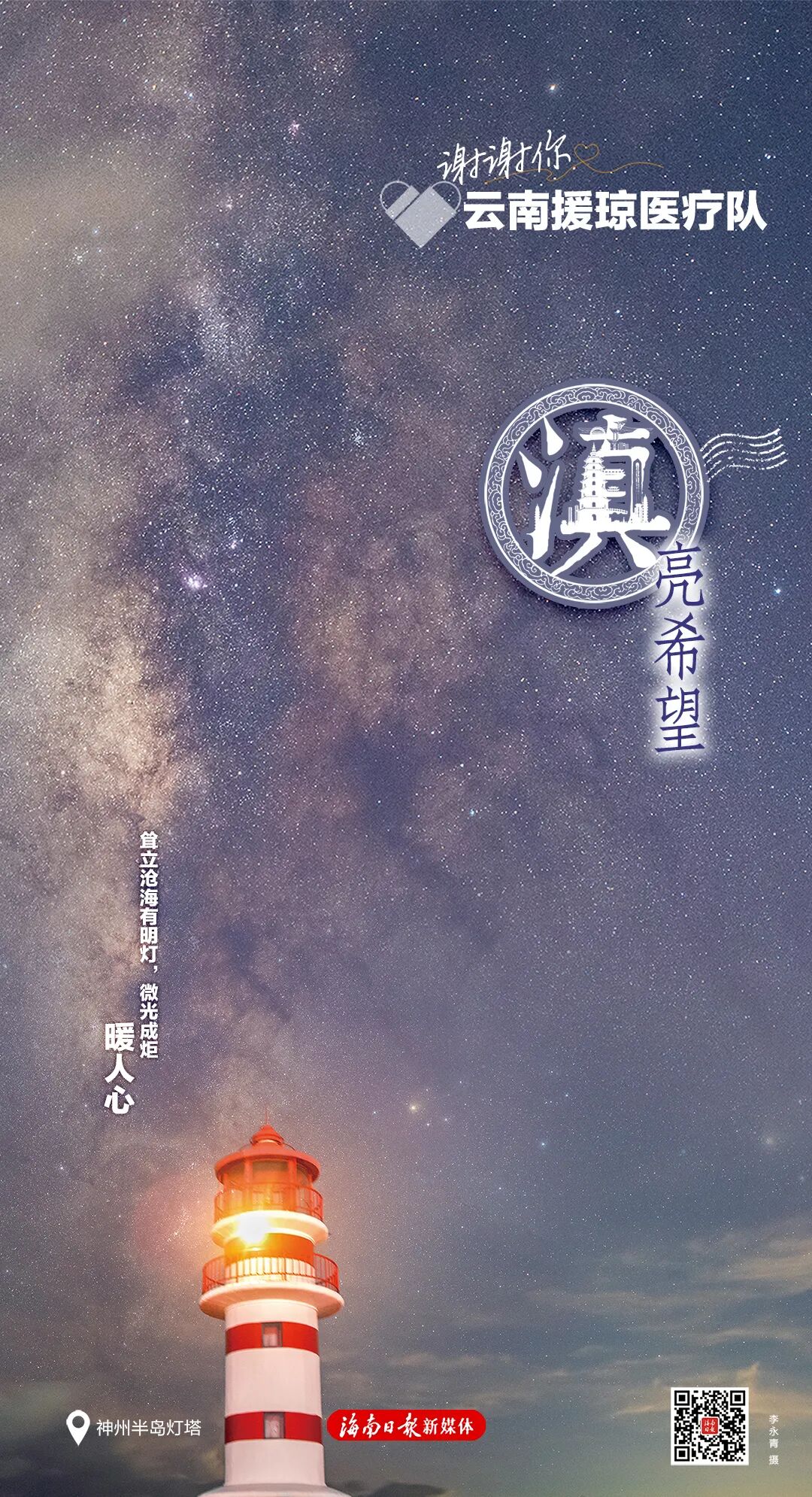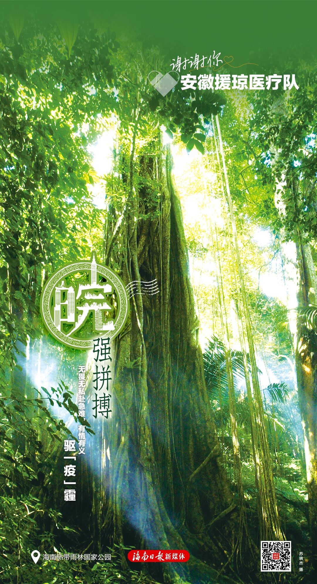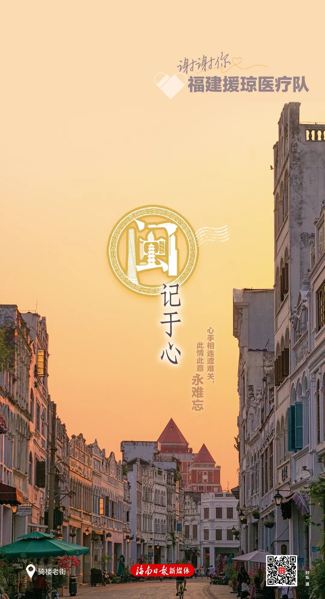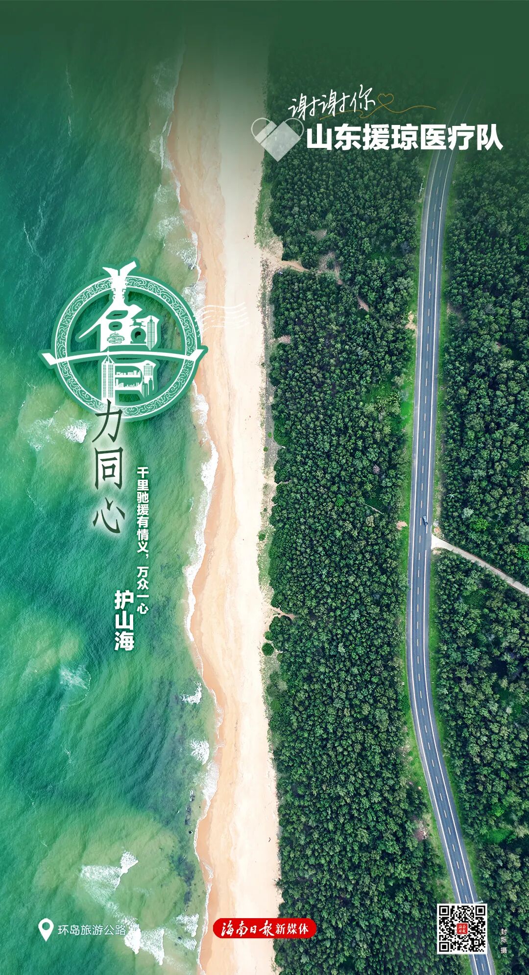 每张海报右下角有一个二维码,扫码可以浏览一封由海南省委、省政府向每位援琼工作者发出的感谢信,以及一个回顾了援琼医疗队与海南并肩作战的珍贵历程与暖心瞬间的创意短视频,以此致敬最美逆行者。