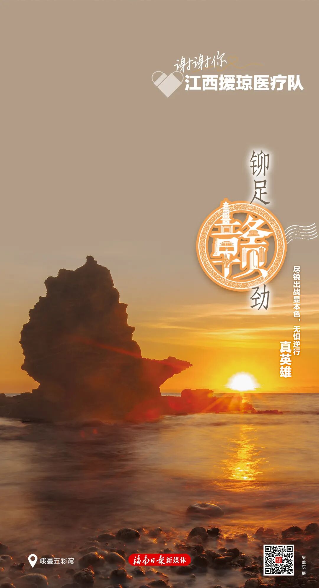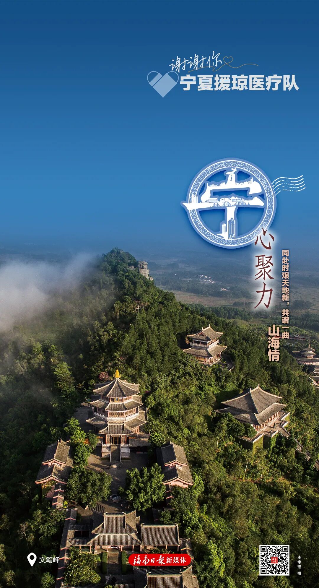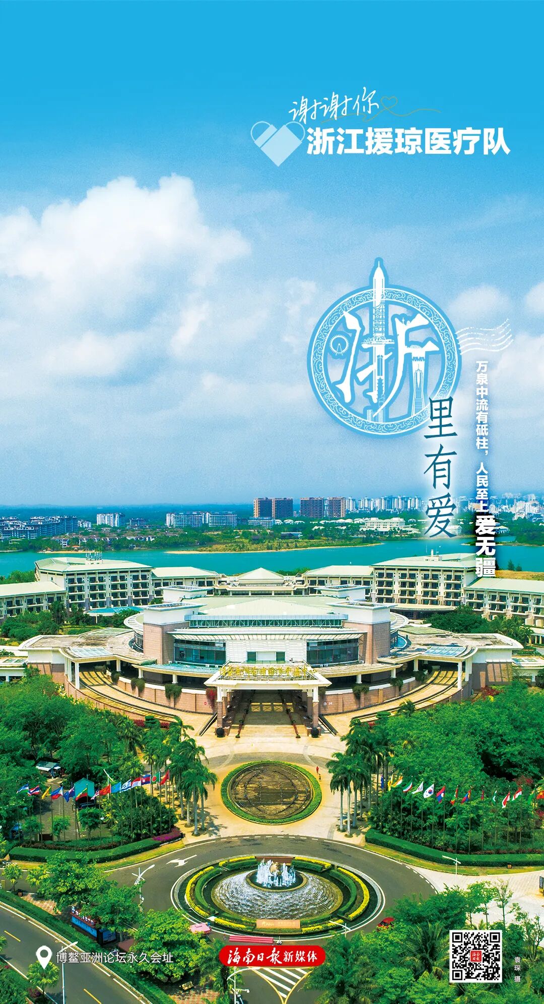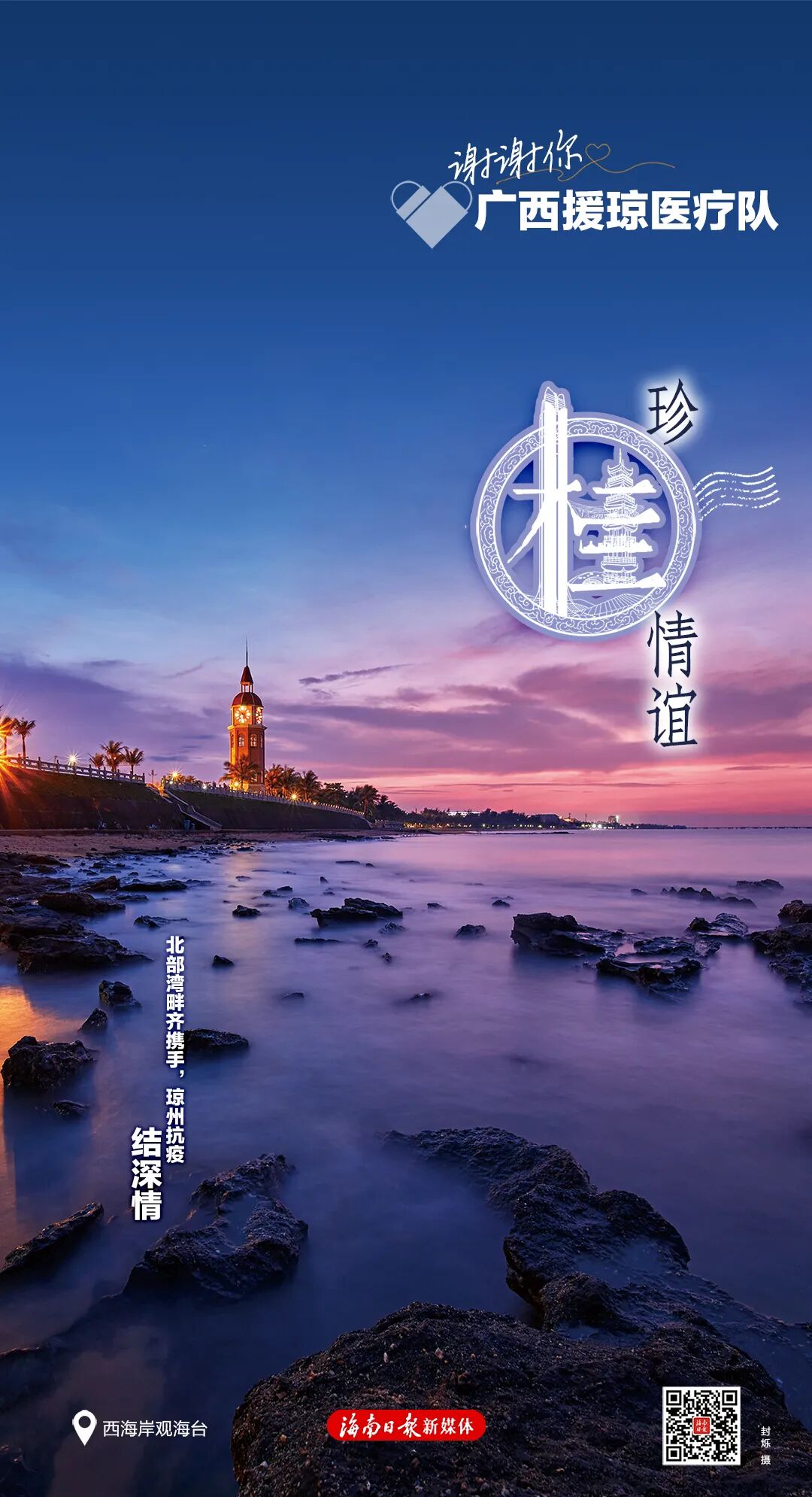 每张海报右下角有一个二维码,扫码可以浏览一封由海南省委、省政府向每位援琼工作者发出的感谢信,以及一个回顾了援琼医疗队与海南并肩作战的珍贵历程与暖心瞬间的创意短视频,以此致敬最美逆行者。