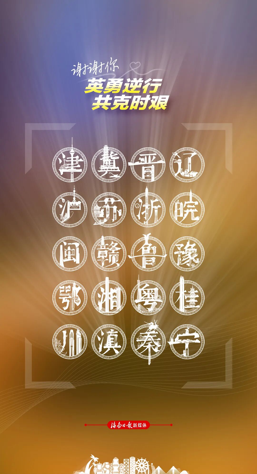 并肩岁“粤”、竭“晋”全力、“滇”亮希望……每张海报的文案均由一个四字主题词与一句主旨句构成,分别融入了20个省份简称的谐音。省区市简称均以“印章”的图样呈现,由各个省区市的地标性建筑、人文历史标志等元素设计而成,每一个“印章”都独一无二,以此表达海南对20个援琼省区市大义善举的由衷感谢。