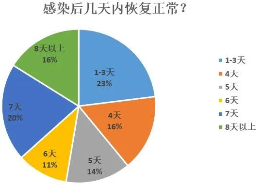 2、问卷中,感染者恢复健康所需的时长不同,61%的感染者处在“感染中,未恢复”阶段。剩余的感染者已走完“由阳转阴”的过程,其中,53%的感染者在5天内恢复,恢复需6天和7天的感染者占比分别为11%、20.5%,而8天及以上才能恢复的感染者占比超过16%。