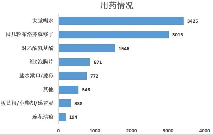 超3000位问卷参与者提醒感染后实测大量喝水、吃几粒布洛芬有效;约3%的参与者认为连花清瘟有效。
