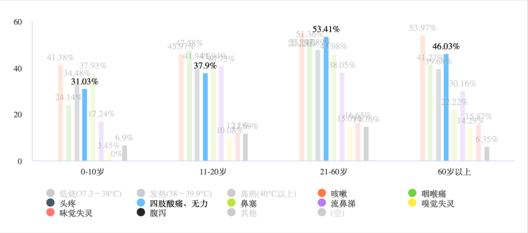 21-60岁人群出现四肢酸痛、无力的比重较其他年龄段高。
