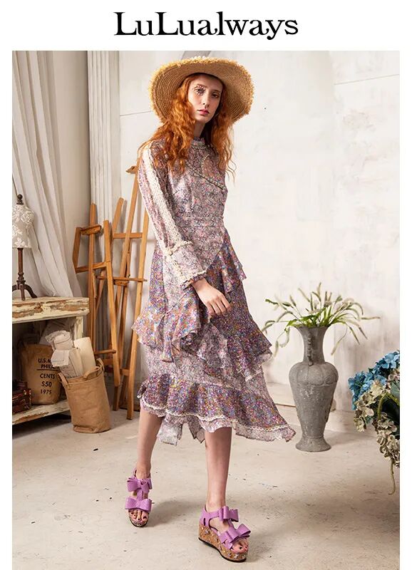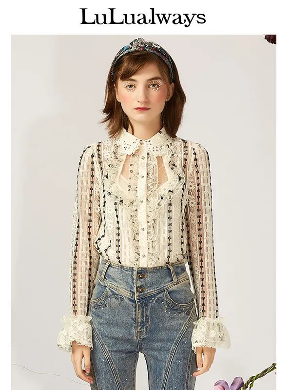 复古碎花“法味十足”半透蕾丝喇叭袖口尽显性感高级