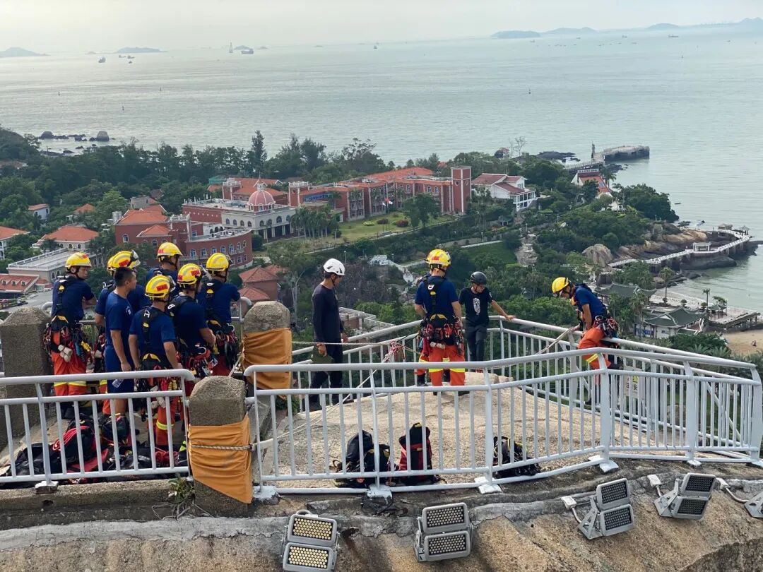 近日,厦门市消防救援支队在鼓浪屿风景区著名地标景点日光岩开展山岳(高空)救援技术培训考核,利用天然悬崖、山道等地形地貌随机设置滑绳下降、救助转移、高空通道等作业科目,以检验消防员训练成果和随机应变能力。