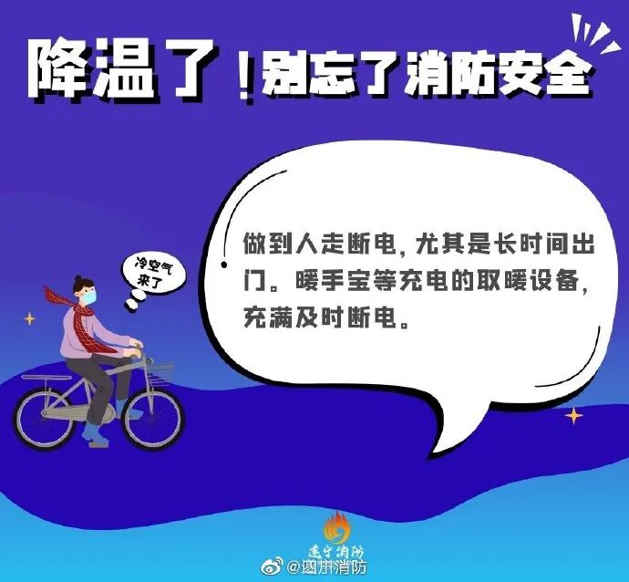 近期气温骤降,来势汹汹的冷空气让人措手不及,一些安全隐患也随之增加!提醒大家在做好保暖工作的同时,也要注意消防安全!