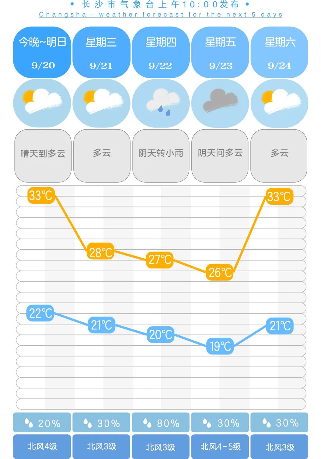 不过,根据长沙市气象台预报,未来一周“秋老虎”即将被冷空气驱赶:19日至24日,多冷空气活动,云系增多,北风加大,长沙最高气温将逐步下降到30℃以下,暑气也将渐退。