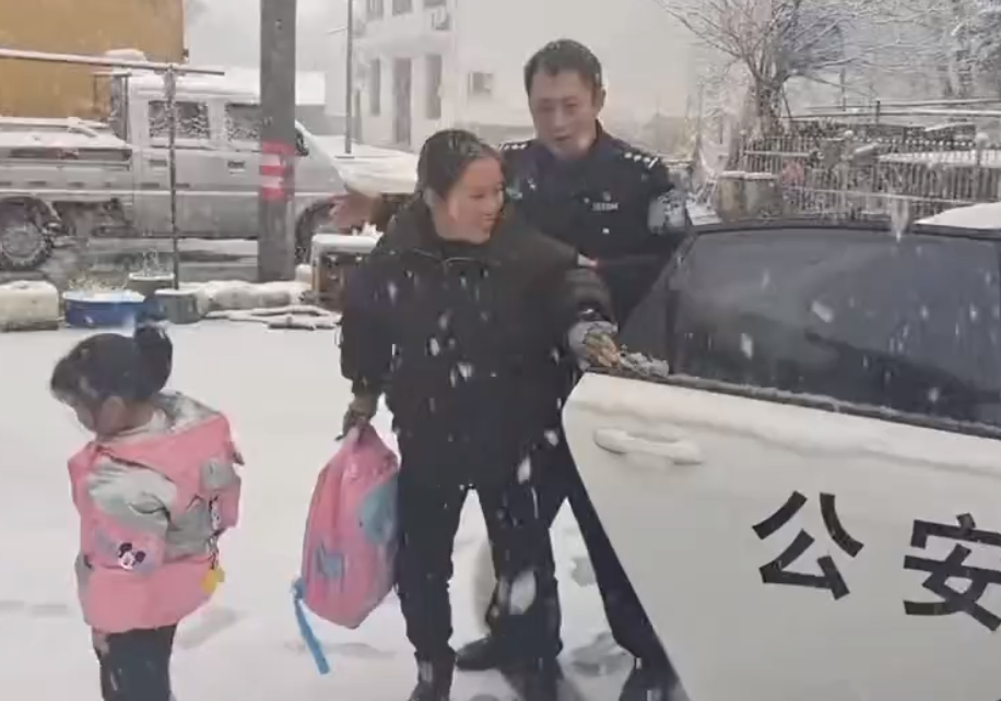 下午3时40分许,在距离沿溪完全小学100多米的路段上,沿溪派出所副所长裴坚任和同事驾驶警车巡逻经过该处时,发现一名中年女子骑着摩托车,停在雪中有些不知所措,摩托车后面还坐着两个小女孩。