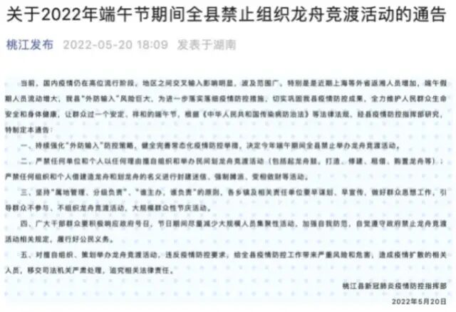 5月20日,益阳市桃江县新冠肺炎疫情防控指挥部发布了《关于2022年端午节期间全县禁止组织龙舟竞渡活动的通告》,通告中提到:持续强化“外防输入”防控策略,健全完善常态化疫情防控举措,决定今年端午期间全县禁止举办龙舟竞渡活动。同时严禁任何单位和个人以任何理由擅自组织和举办民间划龙舟竞渡活动(包括起龙舟鼓,打造、修建、租借、购置龙舟等);严禁任何组织和个人借建造龙舟和划龙舟的名义进行封建迷信、强制摊派、变相敛财等活动。
