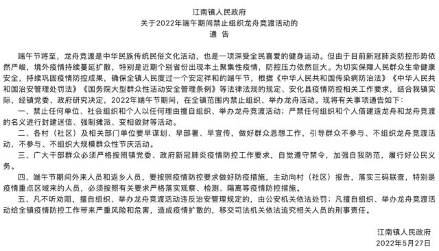 5月27日,安化县江南镇人民政府发布了《关于2022年端午期间禁止组织龙舟竞渡活动的通告》。为切实保障人民群众生命健康安全,持续巩固疫情防控成果,确保全镇人民度过一个安定祥和的端午节,根据《中华人民共和国传染病防治法》《中华人民共和国治安管理处罚法》《国务院大型群众性活动安全管理条例》等法律法规的规定、安化县疫情防控相关工作要求,结合我镇实际,经镇党委、政府研究决定,2022年端午节期间,在全镇范围内禁止组织、举办龙舟活动。