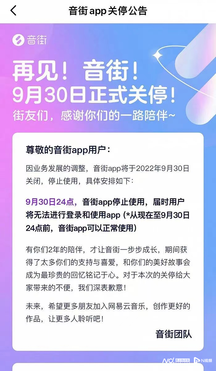 网易云音乐旗下的K歌类APP音街发布关停公告,表示因业务发展的调整,音街APP于2022年9月30日关闭