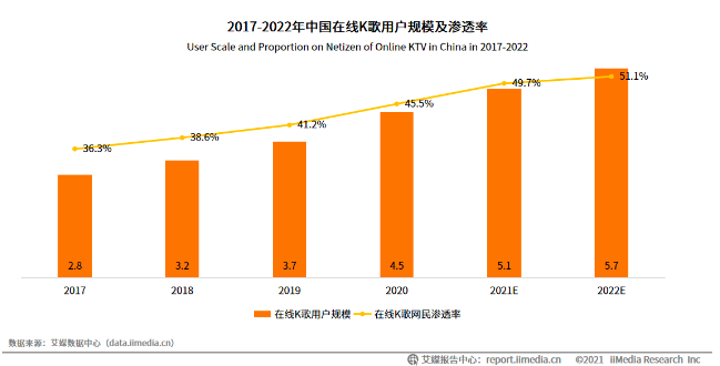 艾媒咨询发布的《2021年中国在线K歌行业发展专题研究报告》显示,2017年-2022年中国在线K歌用户规模及渗透率一直呈现增长态势,预计在2022年达到5.7亿人次,渗透率超50%。而在2021年时,有近七成用户日均使用在线K歌APP的时间超过1小时。
