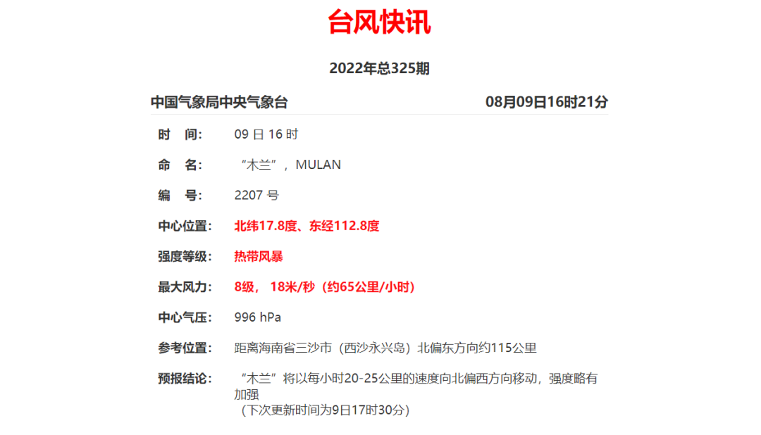 据监测,今年第7号台风“木兰”(热带风暴级),9日15时中心位于北纬17.7度、东经112.8度,也就是在距离西沙永兴岛北偏东方向约105公里的南海海面上,中心附近最大风力8级(18米/秒)。