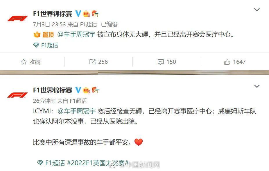 随后,@F1世界锦标赛 发文称,@车手周冠宇 赛后经检查无碍,已经离开赛事医疗中心。
