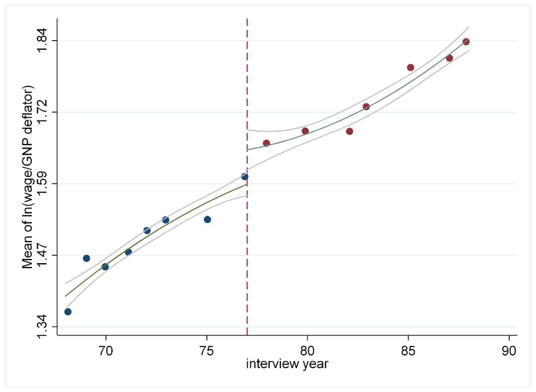 cmogram ln_w year,cut(77) scatter lineat(77) qfitci //这个可以画出RDD回归的图