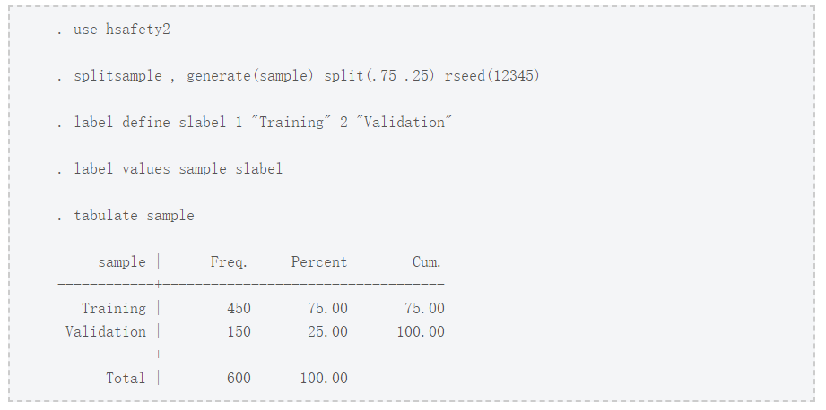 通过生成的样本单向列表(one-way tabulation)可以验证样本是否满足75%–25%的划分要求。