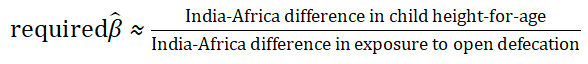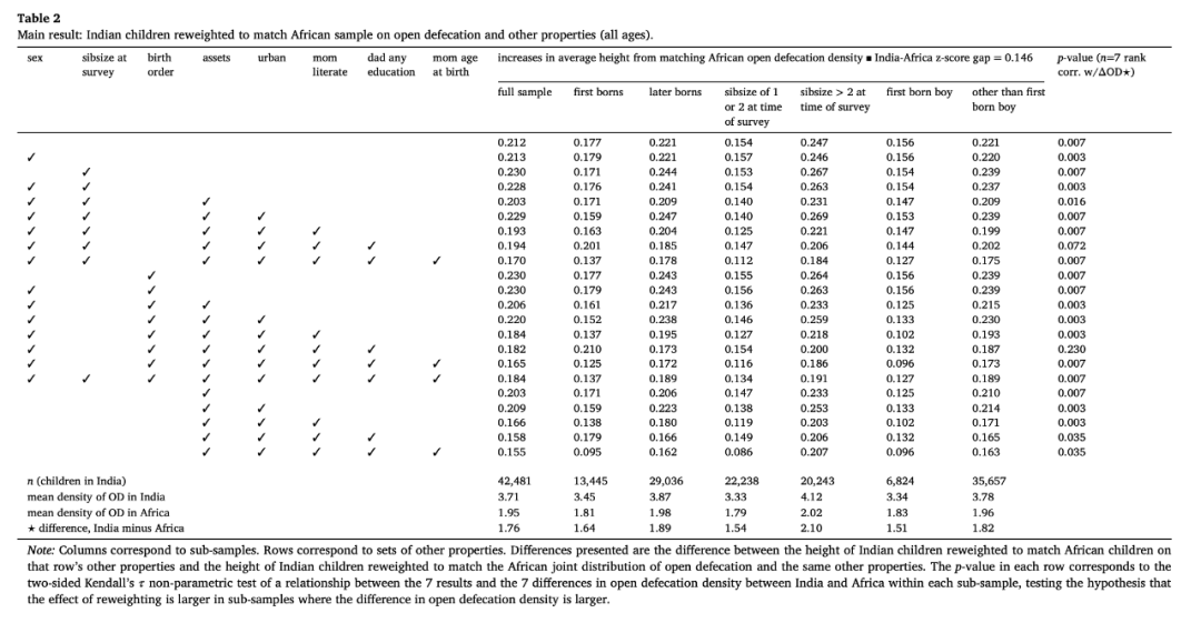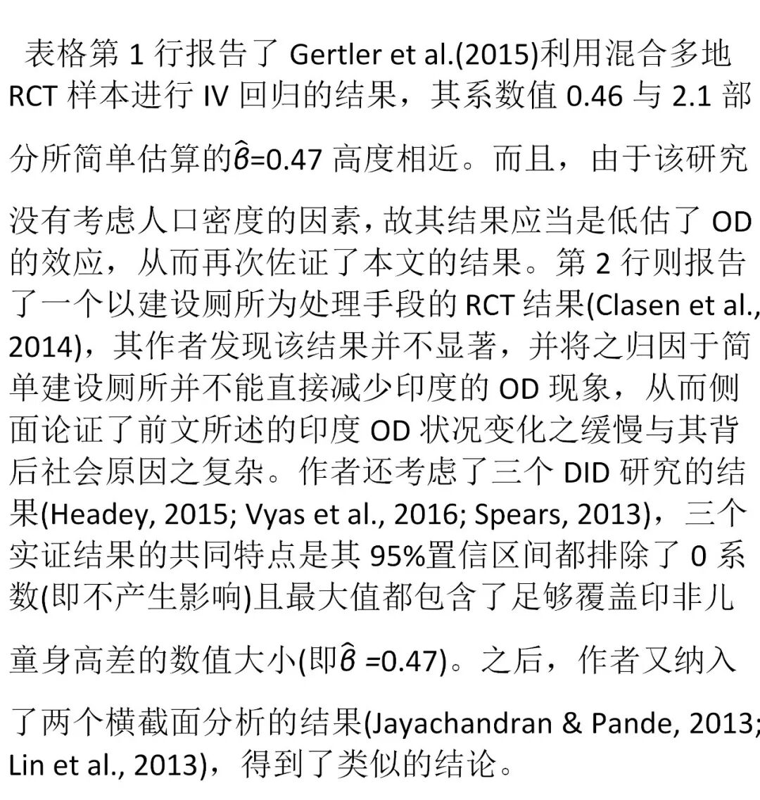 约为0.47。而通过将印度各个村庄本地OD强度对于儿童身高的影响系数进行平均,作者得到了约为0.5的具体数值,这两个数值的接近很好的支持了作者的行将论证的统计假设,即如果印度儿童能够反事实地接触非洲OD密度就能够至少长得跟非洲儿童一样高。当然,在后续具体的实证工作中,作者更多地选用了印非间接触OD密度(exposure to open defecation density)的差距作为