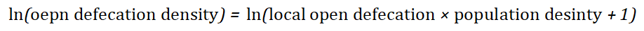 该文依照Jayachandran & Pande (2013, 2017)构建样本的方式,将DHS中2005年的印度数据与27组SSA地区的截面数据混合。其中,一个关键的解释变量是OD密度(Oepn Defecation Density),其对数形式依下式构建:![]()