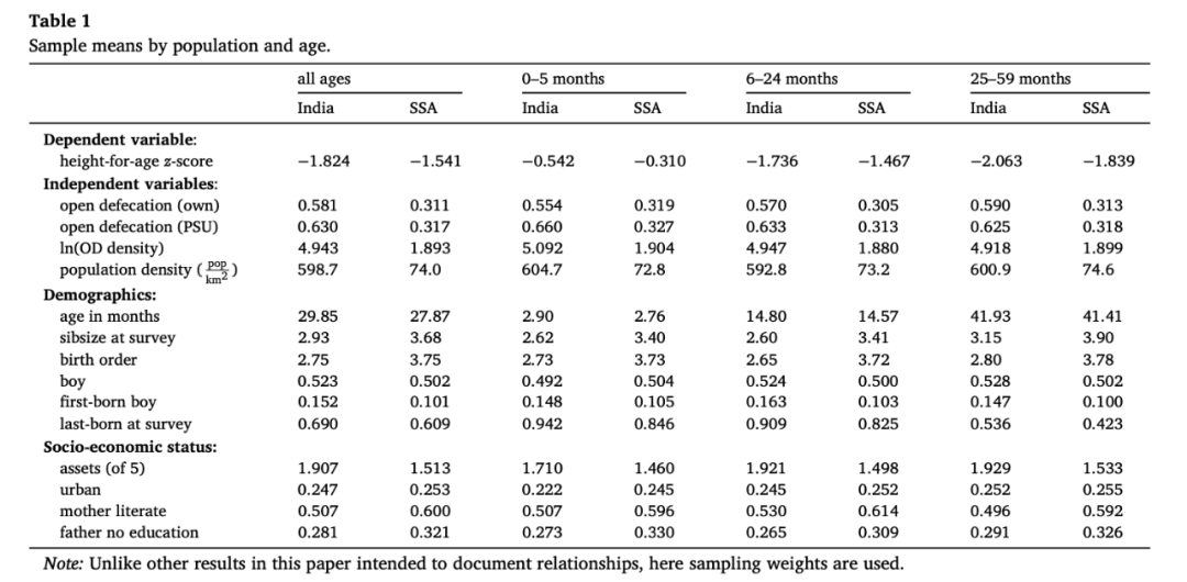 这篇文章的实证工作主要是基于Oaxaca-Blinder分解的思路来回答这样一个问题:如果印度儿童能够反事实地在SSA地区的OD密度下生活,那么他们能够长得跟SSA地区儿童一样高吗?更具体地来说,作者运用了DiNardo et al.(1996)中的非参数再加权方法来预测了在面对与非洲儿童相同的OD密度的分布情况下印度儿童的平均身高。这一方法主要优点包括:给印度儿童所匹配的是非洲儿童所面对的OD密度的整体分布而非仅仅是平均数;且不需要假设相关分布的具体函数形式。3.1 数据与描述性统计