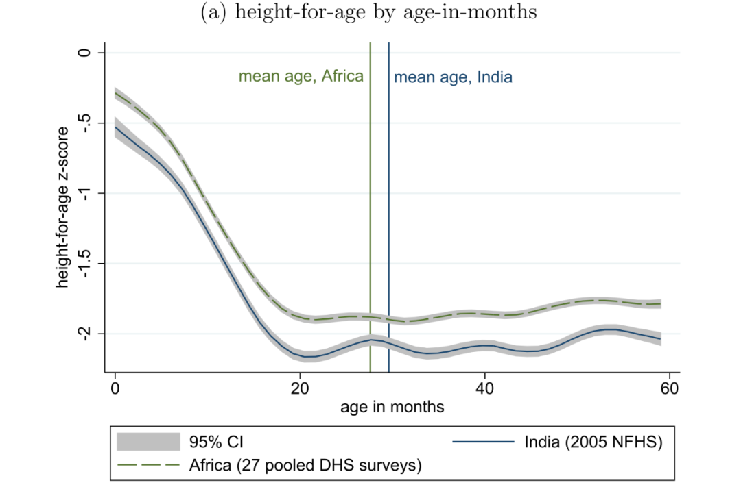 尽管已有大量的成果研究了印度的国民健康状况和其发展成就的不匹配,但关于儿童身高的研究仍然有所欠缺。通过利用USAID(美国国际开发署)所主导的DHS(Demographic and Health Surveys,人口健康调查)提供的混合截面数据和2005年的印度NFHS(National Family Health Surbey,国家家庭卫生研究)统计数据,该文得到了图1以体现所谓的“亚洲之谜”。![]()