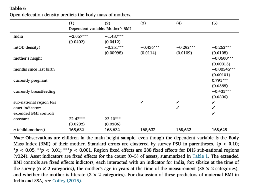 文章此前的工作在某种意义上仅研究了OD影响儿童身高的第一种机制,即直接通过儿童接触来影响。在这一部分,作者主要是通过利用母亲的体重作为被解释变量来研究第二种机制即通过母体营养影响儿童身高的可能性。但Coffey & Spears (2018)也说明了本研究中存在的数据缺陷:由于母亲们的体重是在DHS开展期间称量并获取的,而非是在怀孕期间获取的,因此研究结论将无法区分第二种机制究竟是在怀孕期间还是在哺育儿女期间发挥作用。![]()