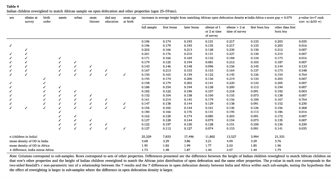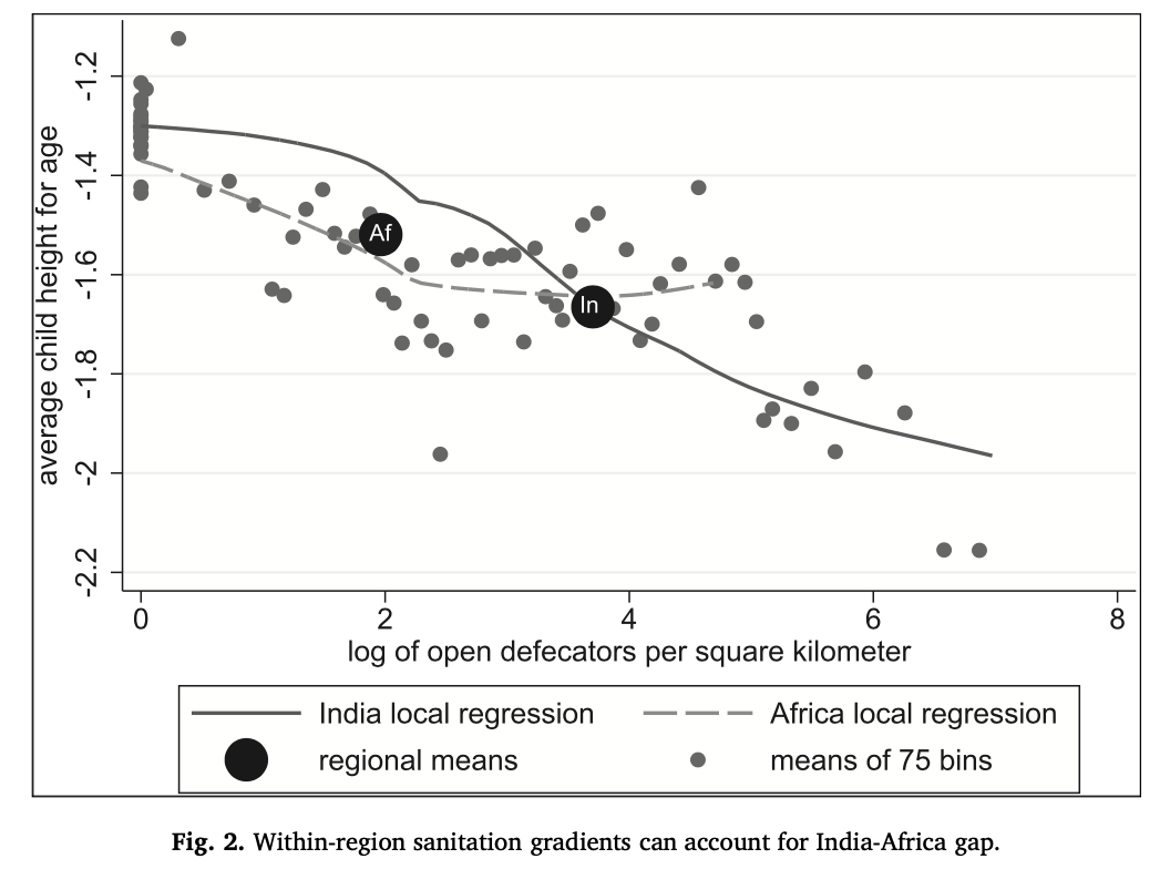 Exposure to open defecation can account for the Indian enigma of child height, Journal of Development Economics.Physical height is an important measure of human capital. However, differences in average height across developing countries are poorly explained by economic differences. Children in India are shorter than poorer children in Africa, a widely studied puzzle called “the Asian enigma.” This paper proposes and quantitatively investigates the hypothesis that differences in sanitation — and especially in the population density of open defecation — can statistically account for an important component of the Asian enigma, India's gap relative to sub-Saharan Africa. The paper's main result computes a demographic projection of the increase in the average height of Indian children, if they were counterfactually exposed to sub-Saharan African sanitation, using a non-parametric reweighting method. India's projected increase in mean height is at least as large as the gap. The analysis also critically reviews evidence from recent estimates in the literature. Two possible mechanisms are effects on children and on their mothers.