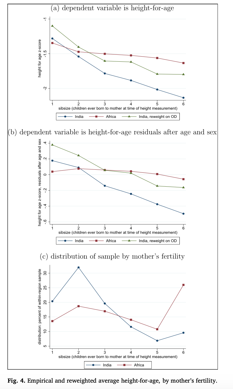 此外,作者还关注了母亲的生育能力对于儿童身高的影响。在运用非参数再加权法进行正式研究前,作者通过绘制图4简单考察了这两者的关系。其中,母亲的生育能力由调查时其所生育的孩子数量衡量。根据panel(a)和panel(b)可以明显地观察到拥有更强生育能力的印度母亲,换言之生了更多孩子的印度母亲,其孩子身高会更低,而非洲母亲身上则没有体现这么强的负相关关系。